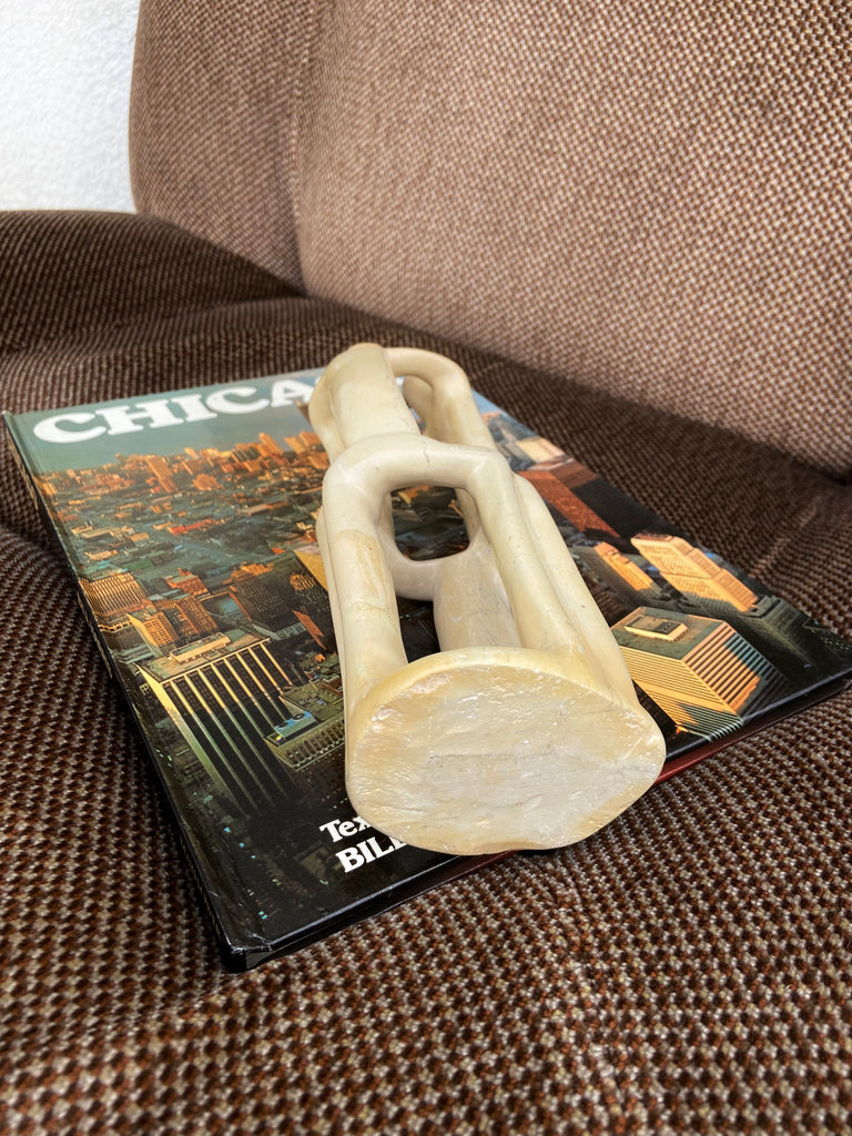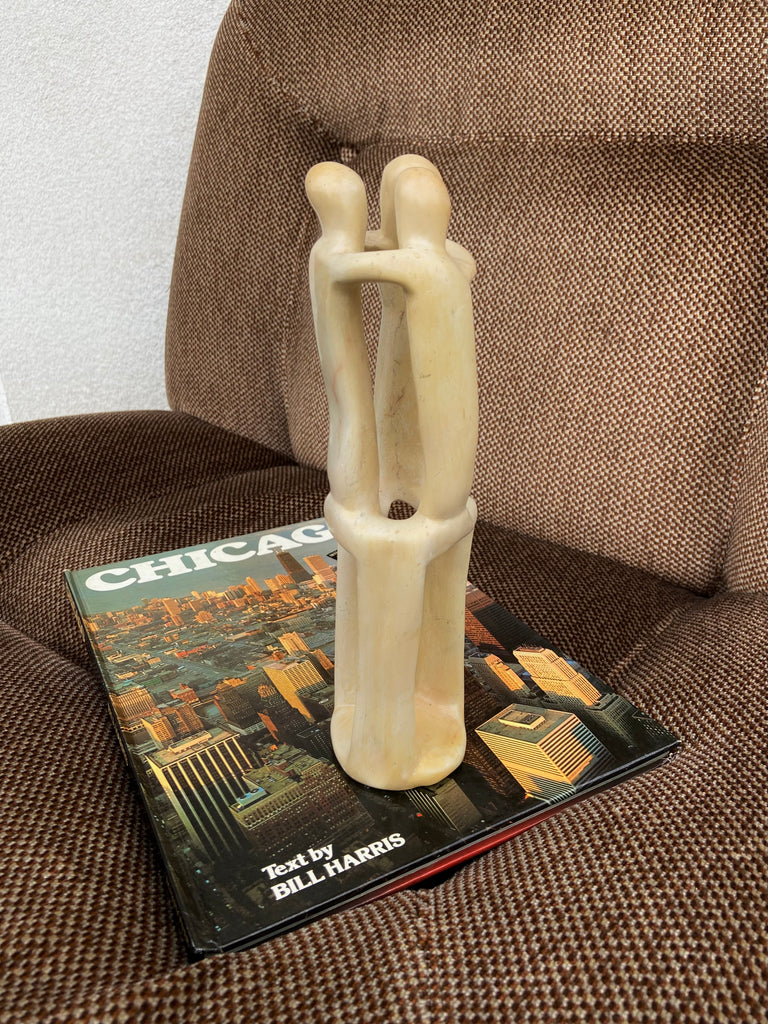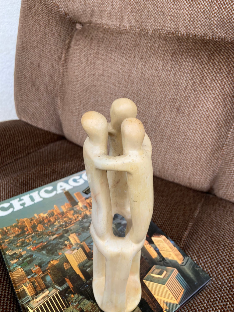 Elegantiška rankomis drožta muilakmenio (soapstone) skulptūra, vaizduojanti apkabinančią porą arba vadinamąjį „Circle of Friends“.