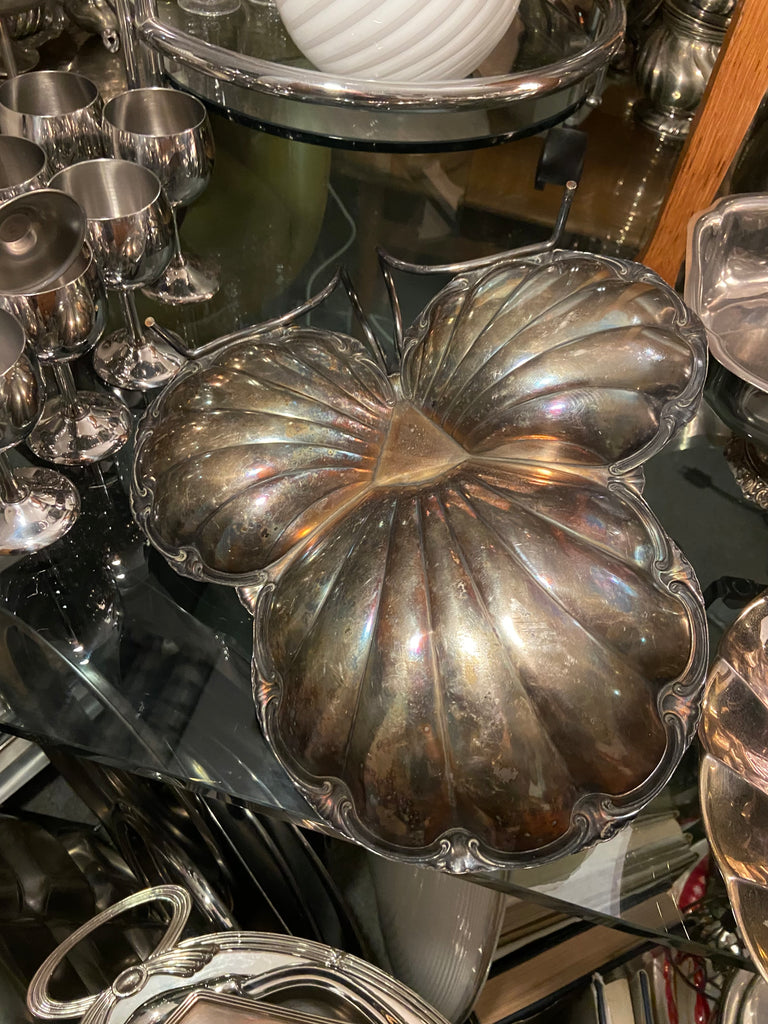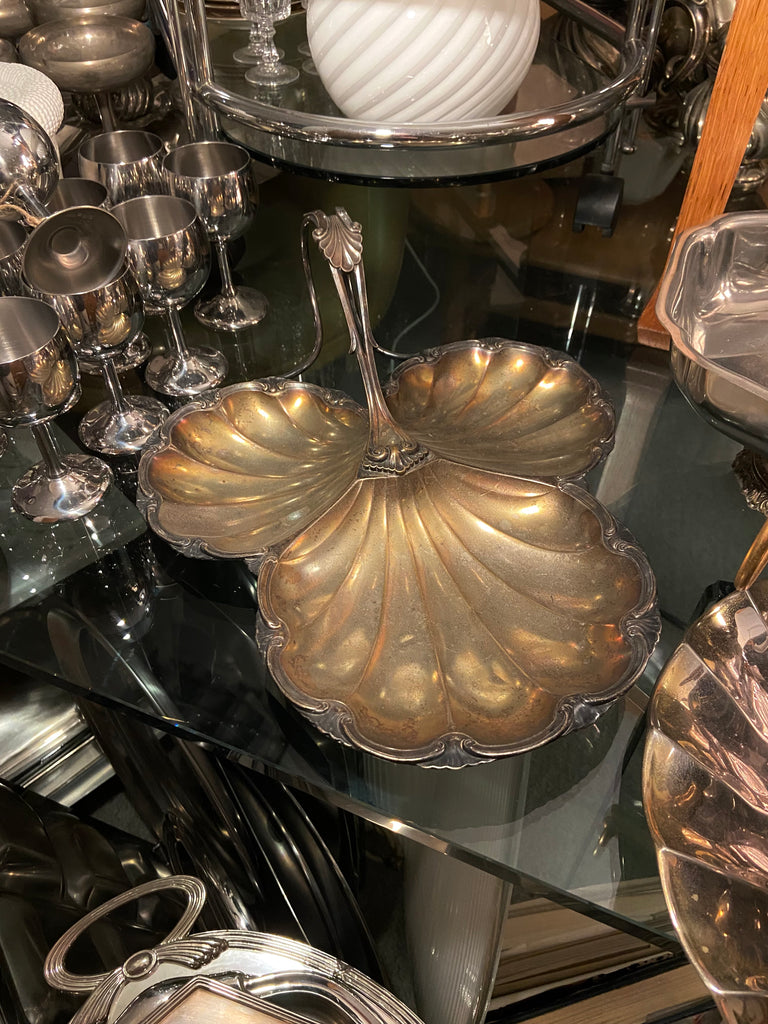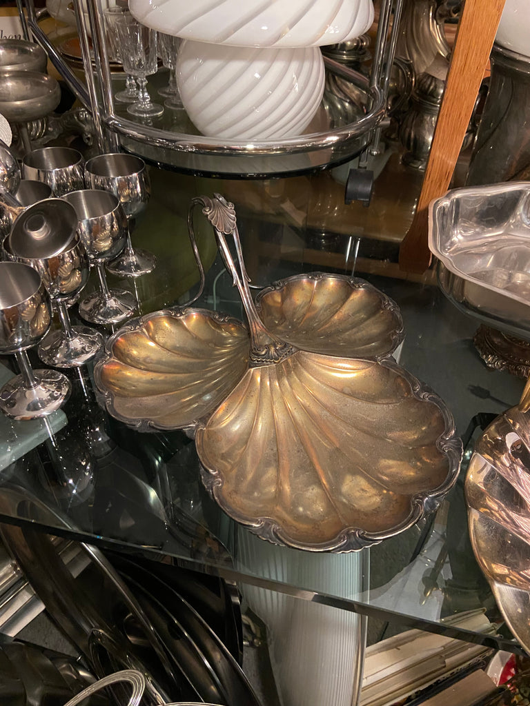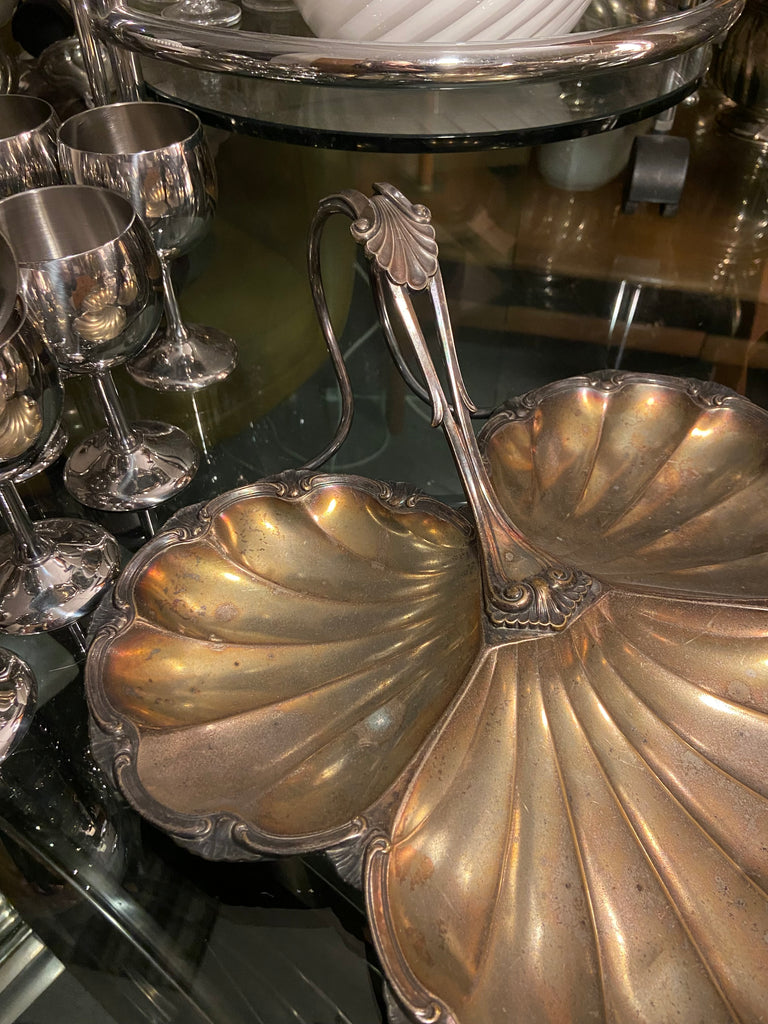 Elegantiškas, sidabru dengtas padėklas rankena, puikus indas antikvarinės kolekcijos papildymui.
