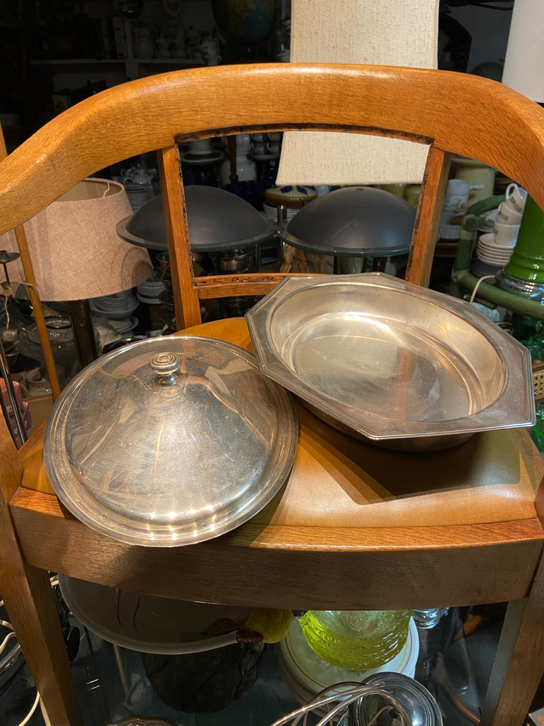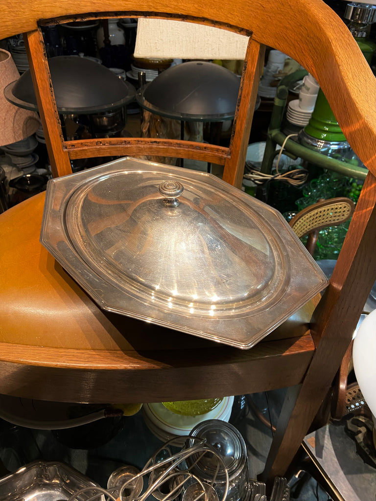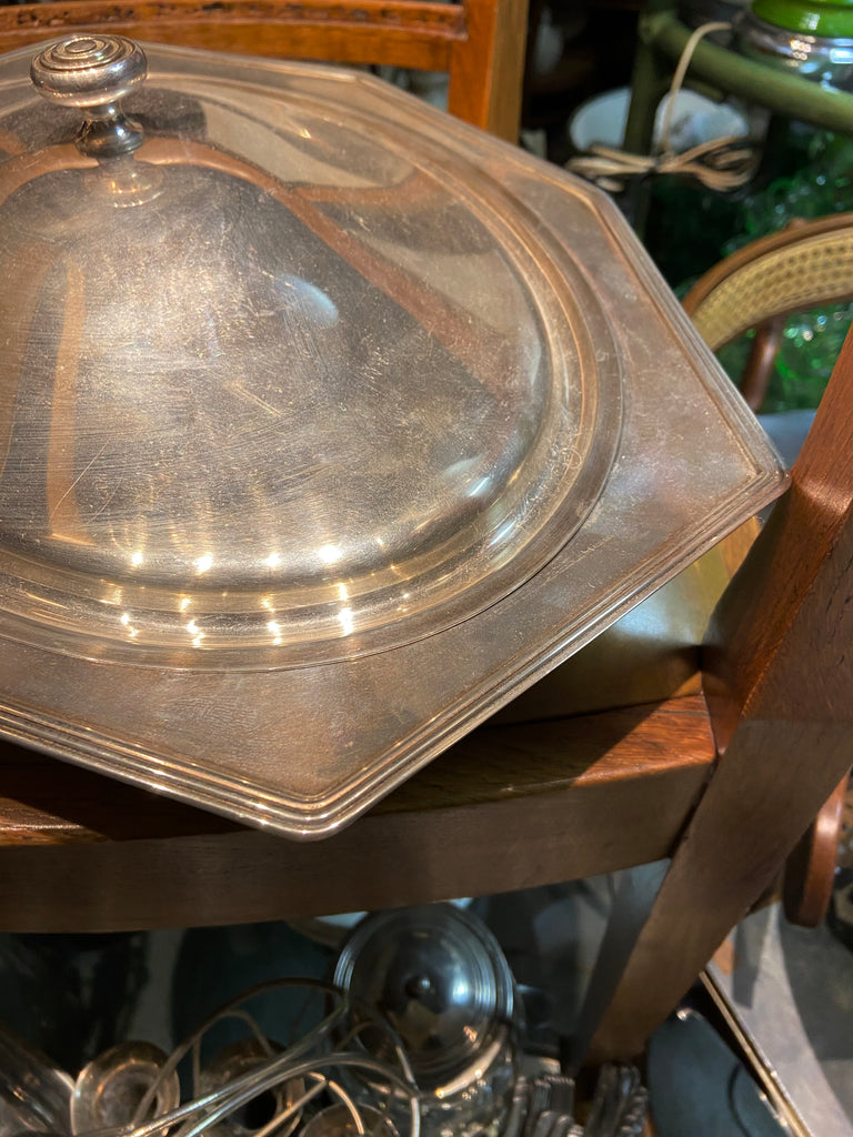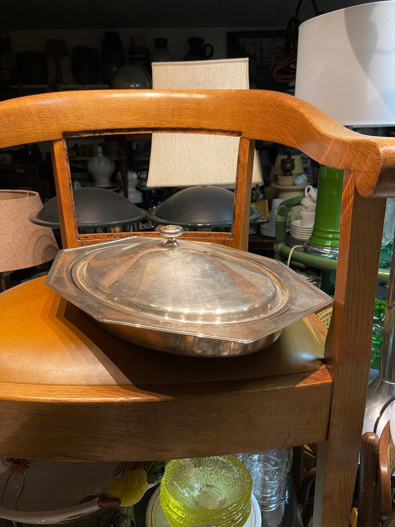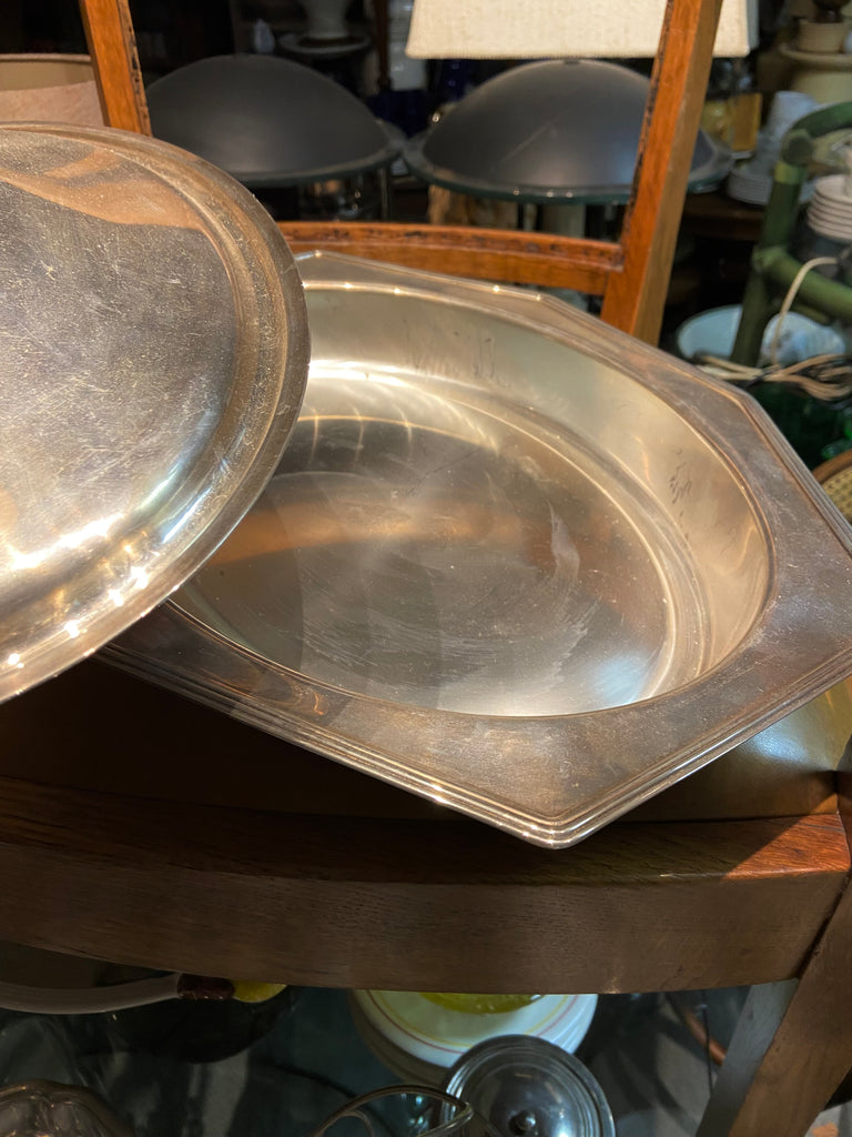 Sidabru dengtas vintažinis serviravimo indas su dangčiu. Elegantiškas, XX a. vidurio sidabru dengtas serviravimo indas, dar vadinamas karštų patiekalų indu (chafing dish) ar entrée indu.