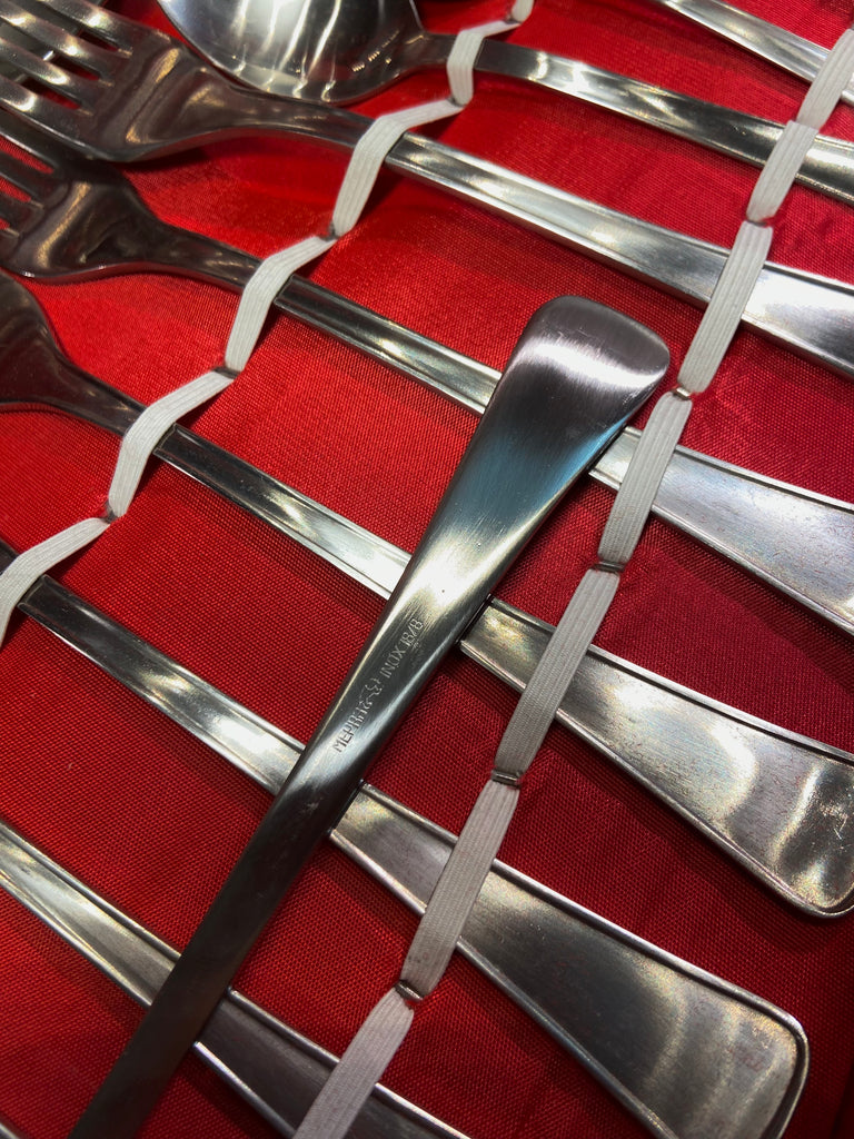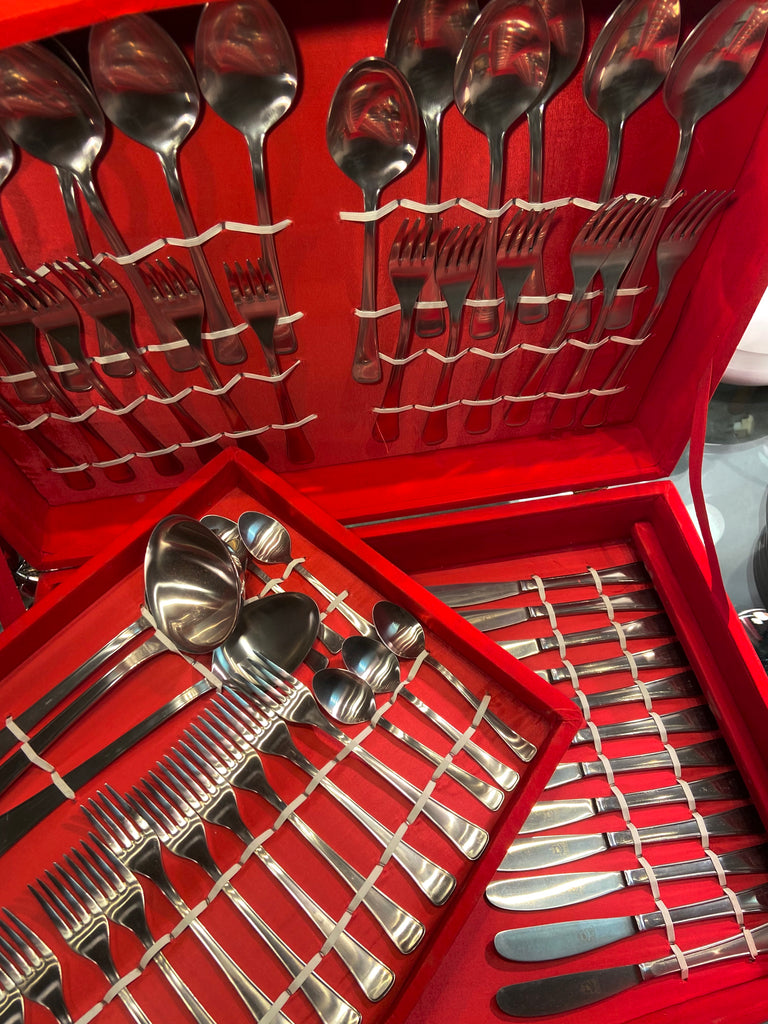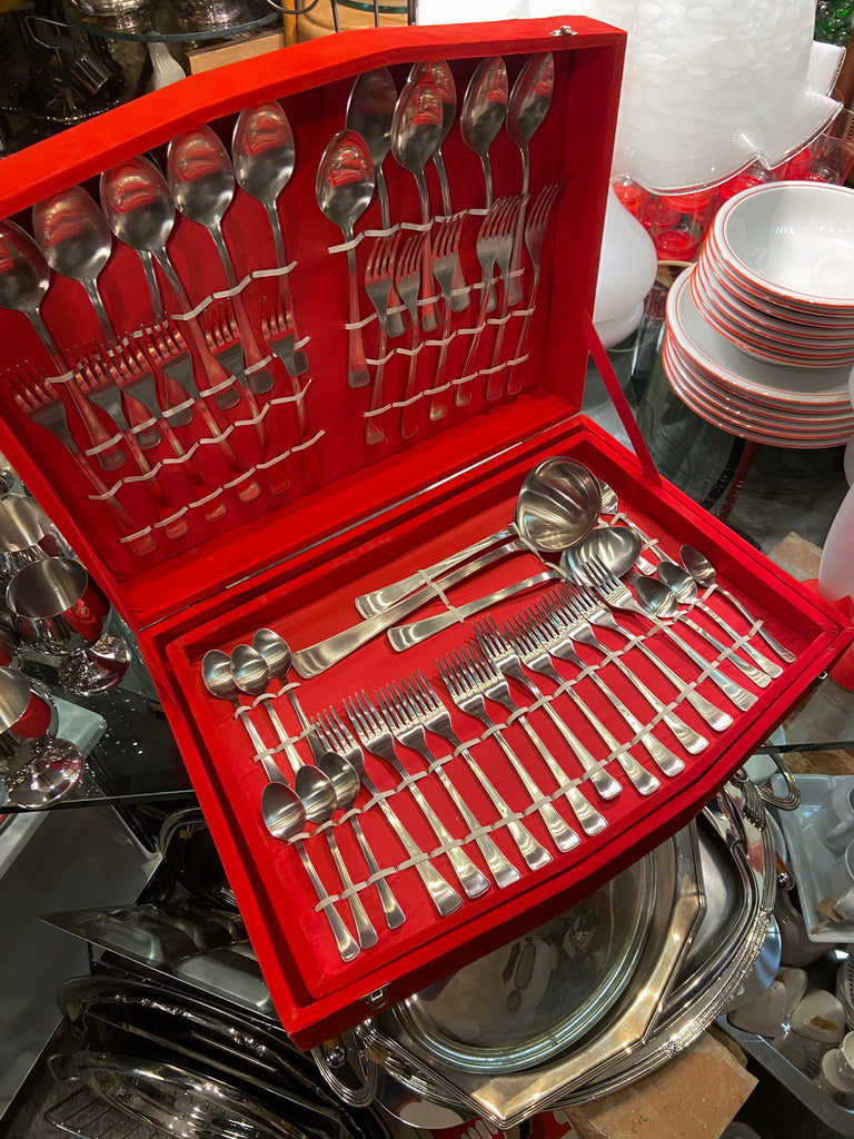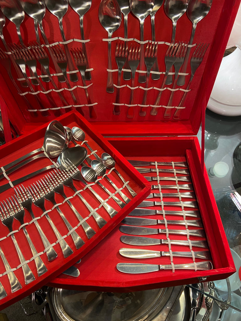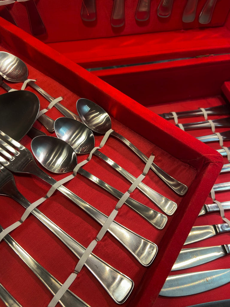 Didelės apimties nerūdijančio plieno (18/10) rinkinys su peiliais, šakutėmis, šaukštais ir serviravimo įrankiais. Klasikinio dizaino, masyvūs, kokybiški įrankiai, tinkantys tiek kasdieniam naudojimui, tiek šventiniam serviravimui. Visi įrankiai sudėti į raudoną dėklą. Būklė gera, be didelių nusidėvėjimo žymių.