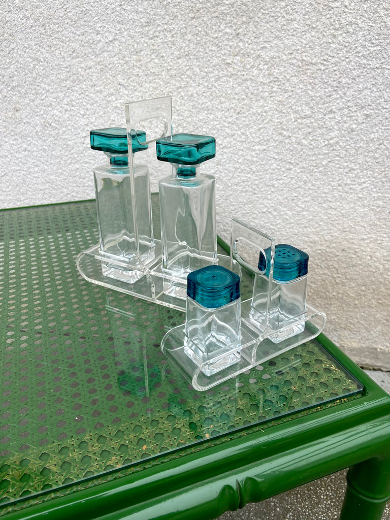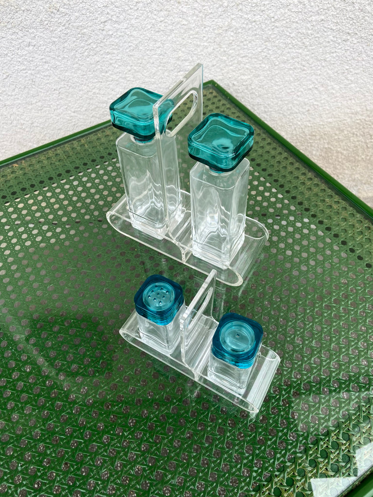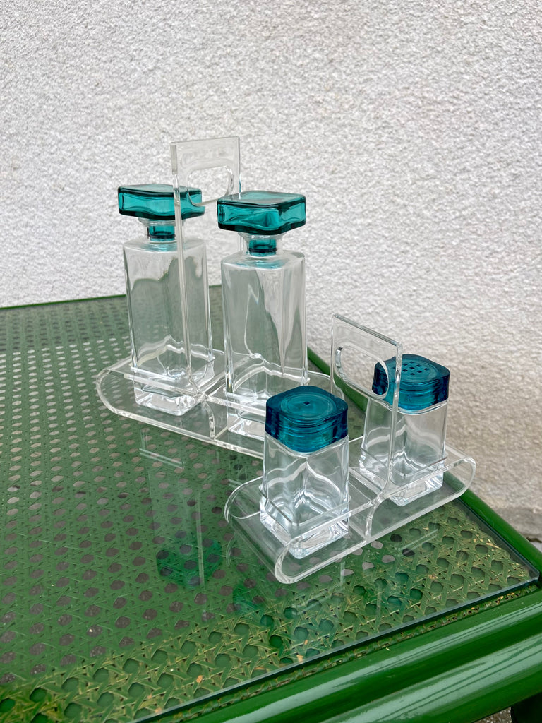 Vintažiniai „Luigi Bormioli“ laikikliai, alyvuogių aliejui, actui, druskai ir pipirams.